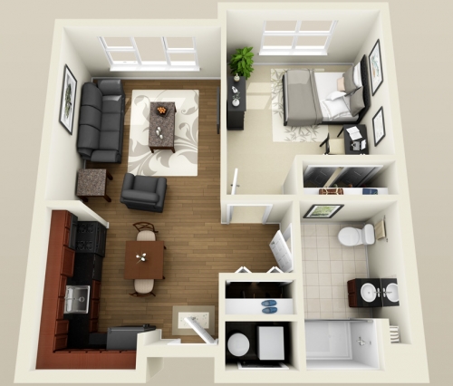 One Bedroom Apartment Floor Plans 3D - Each of our apartment options comes with modern fixtures.